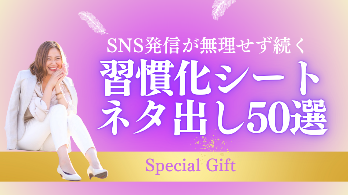 集客編 SNS発信が無理せず続く習慣化シート&ネタ出し50選 こちらは「感覚派さんの“脱迷子”!あなたらしい働き方で月50万円を目指す1day講座」にお申し込みいただいた方に受け取れる特典です🌸 感覚派さんの“脱迷子”!あなたらしい働き方で月50万円を目指す1day講座 ▶︎ 以前 高額商品でも契約いただける4つのポイント 最近 1分で作れる!チャットGPTを使ったインスタ投稿作成テンプレート これも好きかも リアルとオンラインを使いこなす感覚派のための集客バランス講座 2025年4月23日 1分で作れる!チャットGPTを使ったインスタ投稿作成テンプレート 2025年4月23日 営業せずに売れるビジネスツール 2025年4月23日